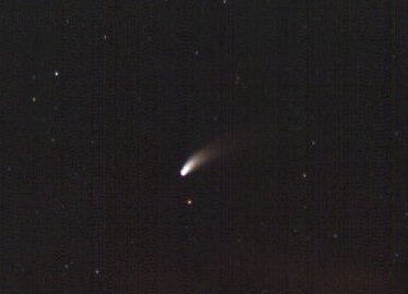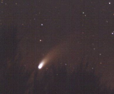 In case you hadn't guessed, this is Comet Hale-Bopp. The bright thing, that is. The sort of frondy stuff in the lower part of the picture is some trees. So why is Monty taking pictures of trees, you may ask? Well, unfortunately, on the night in question, some fool had let off a small thermonuclear device down at The Fin (tut! Boys!), and the resultant glow caused more light pollution to the sky than Peeps ritual sock-bonfire. So poor old Monty had set off, telescope in hand and special funky film in his camera, down to the ancient and mysterious