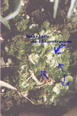 See the funky little cup-like protrusions? Those are where the gametes live, and when a dirty great raindrop comes along and hits the shy, retiring etc.. plantlet... Blooooosh! Out fly all the gametes, doing what gametes do best, which is swimming around looking for other gametes to indulge in a bit of fertilization with! Yes - raw sex in the plant kingdom! You read it first on Mudshark Towers!
